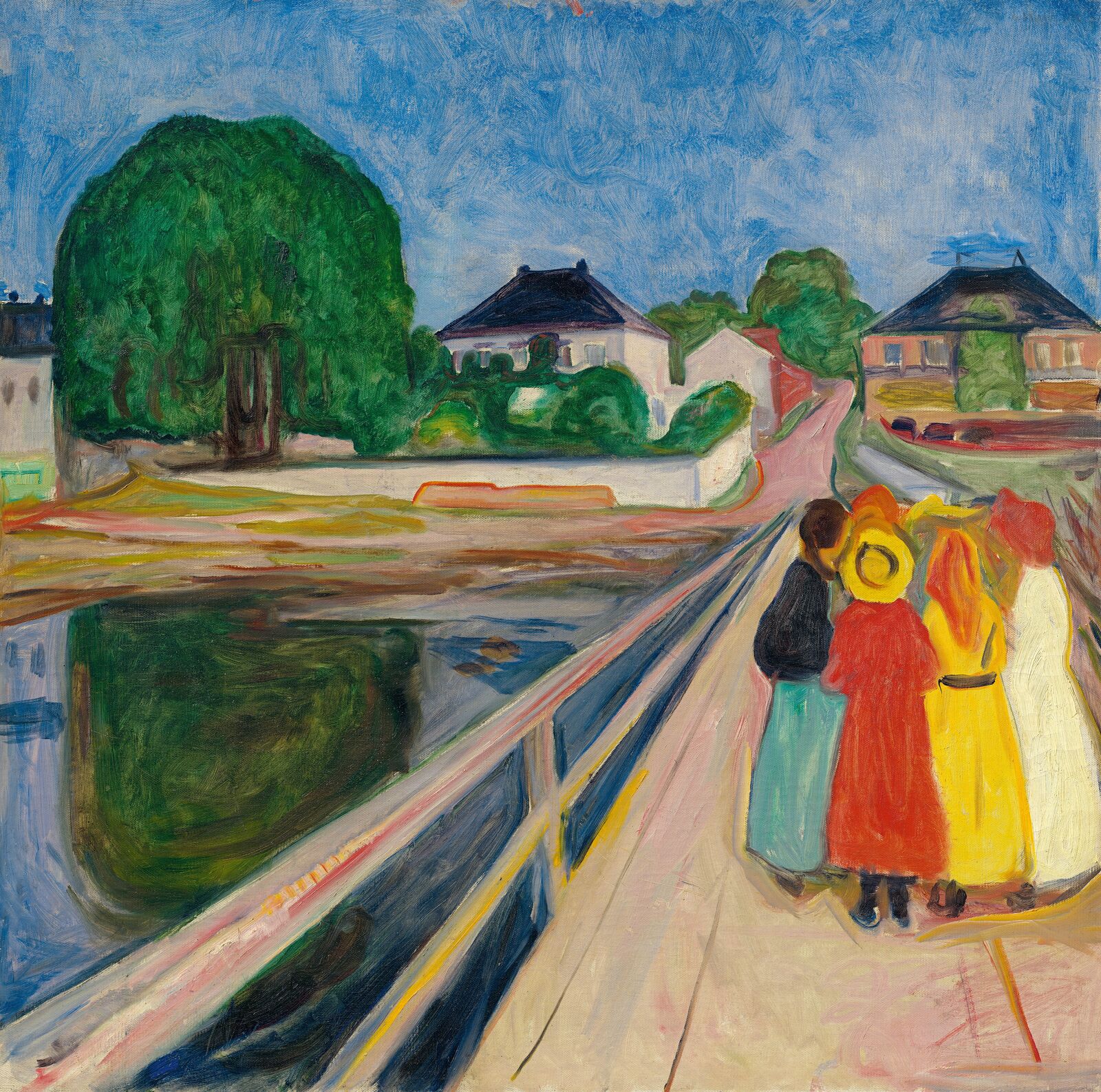 Zu Munchs berühmtesten Motiven gehören die Mädchen oder Frauen auf einer Brücke. Von diesem Gemälde gibt es viele Varianten und Versionen, so aus dem norwegischen Dorf Åsgårdstrand vor dem Landhaus Kiøsterud, das dem Künstler gehört. Die Mädchen umweht ein Hauch von Geheimnis, sie scheinen zu kichern, zu flüstern. Vor allem wirken sie gesund und glücklich. Sie bilden eine Einheit, untereinander und mit der schimmernden Abendstimmung. Der Ausblick, hier auf das Ufer mit Häusern, ist bei Munch selten. Er ist der Meister des Mittelgrundes, hat also kaum Vorder- und fast nie Hintergrund, was eine besondere Intensität erzeugt. Ähnlich wird das, gerade für das Mädchen-Motiv, Munchs Künstlerfreund Max Liebermann gesehen haben. Liebermann findet, „dass dies mein bestes Bild ist“, erzählt später Munch.