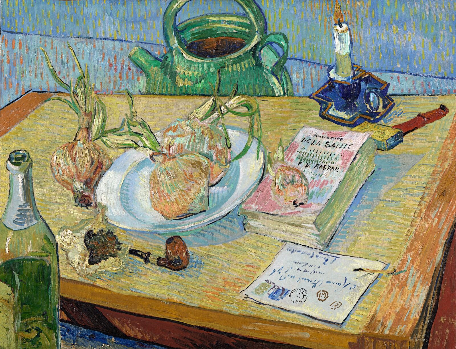 Tabakbeutel, Pfeife und eine leere Absinthflasche deuten die kleinen Freuden des Alltags an, die Van Gogh sich bisweilen gönnte.