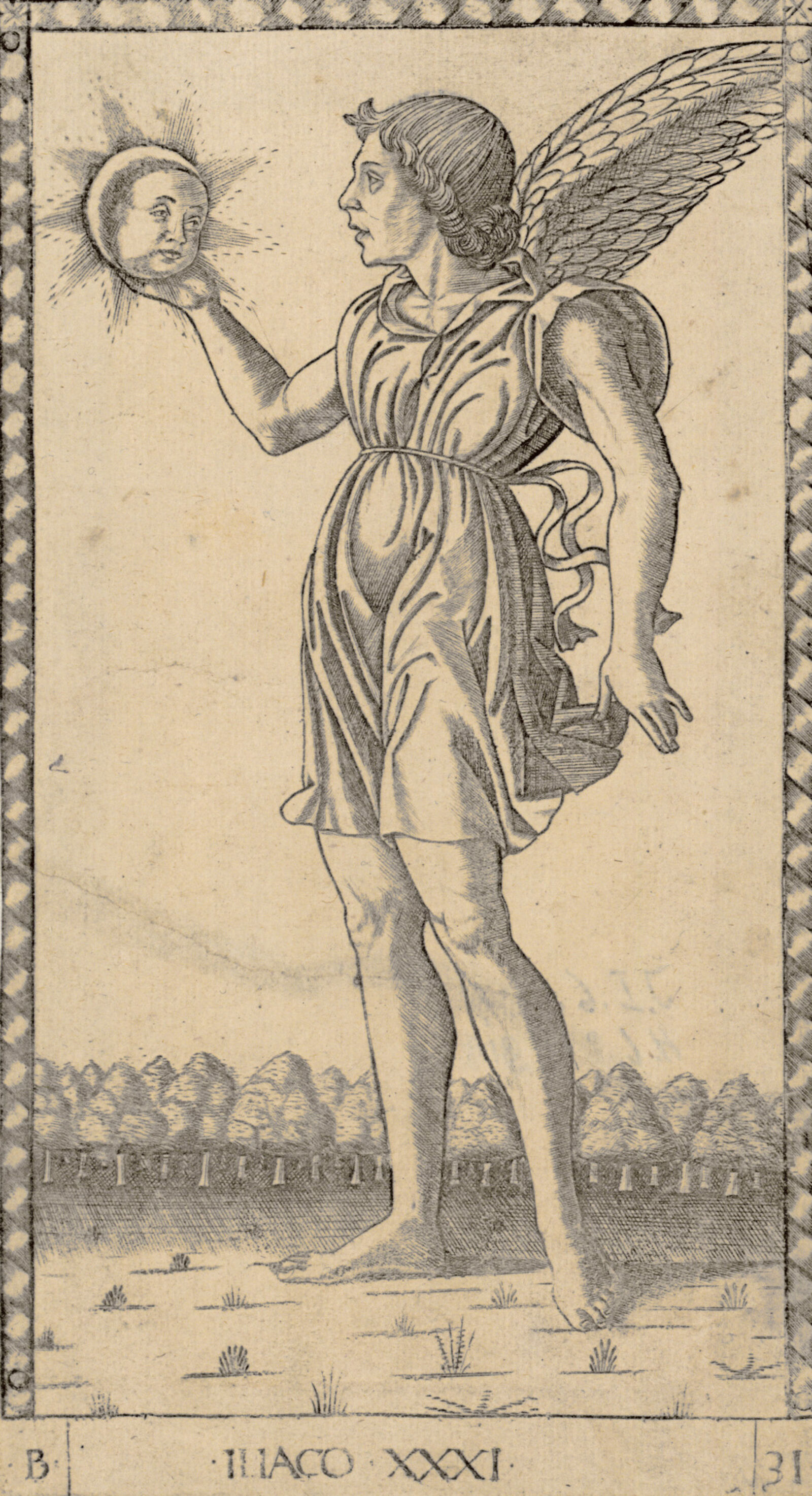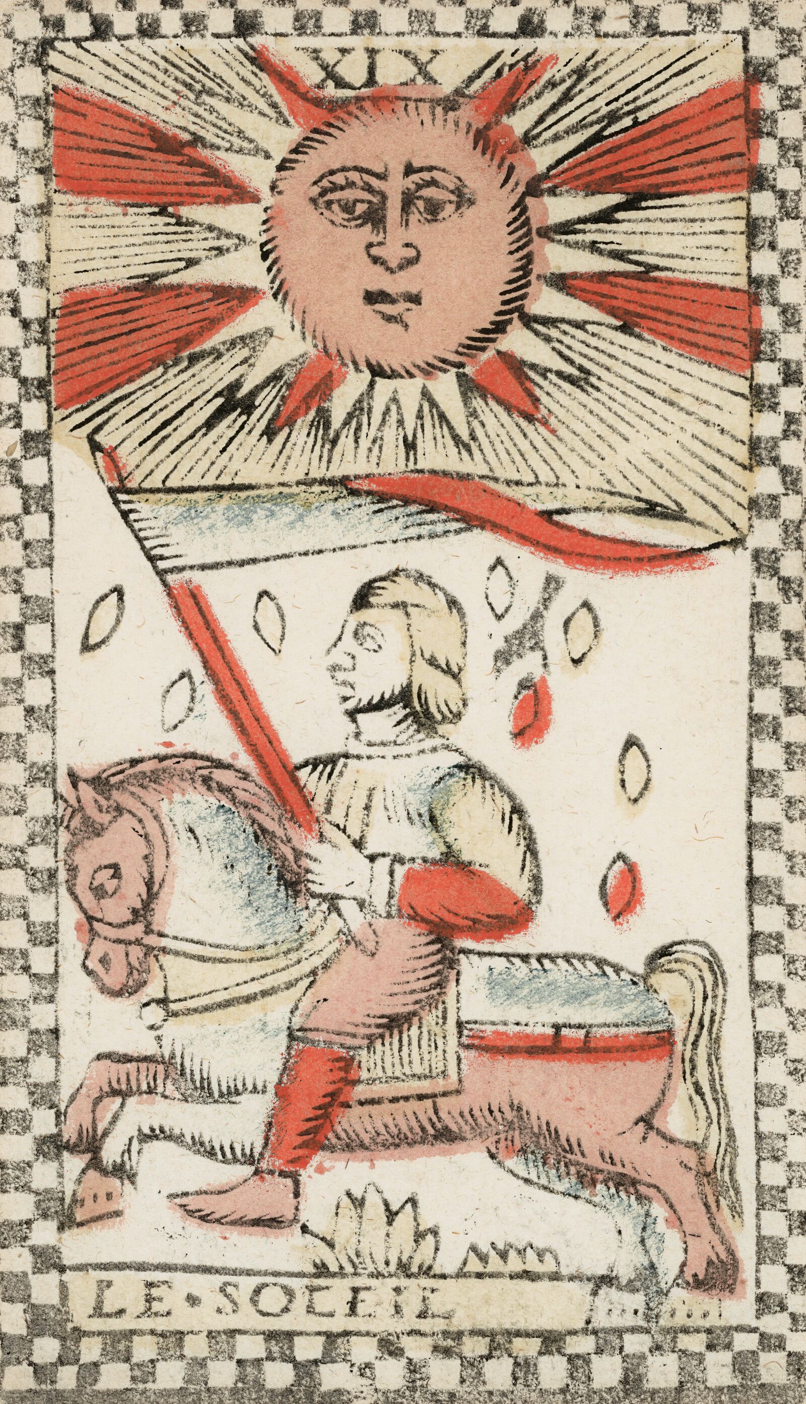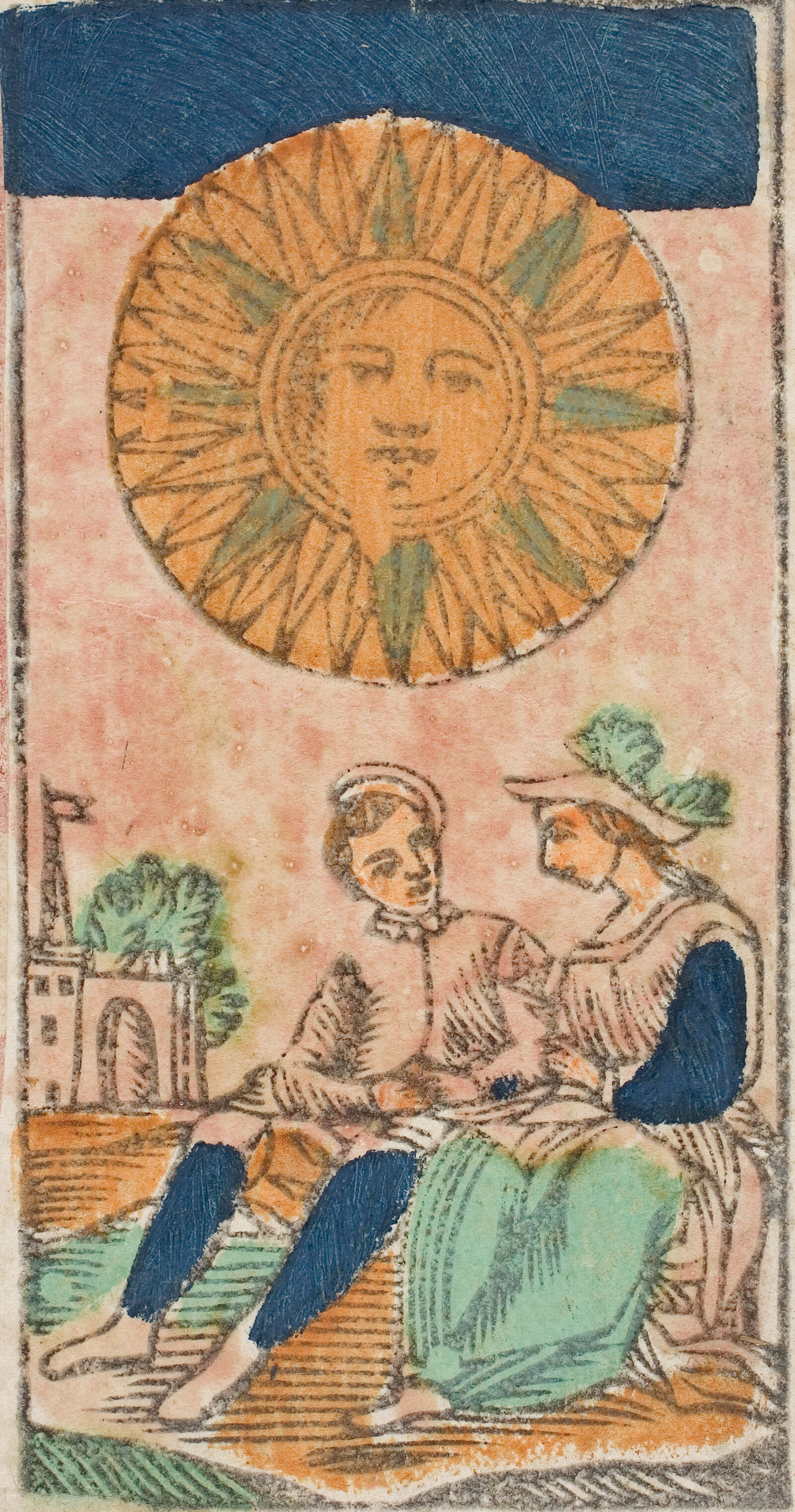 The colored woodcut is the trump card of the sun from the game of tarot. In esoteric thought, tarot cards are used for divination, and the traditional iconography of the cards is interpreted as foretelling one’s fate.