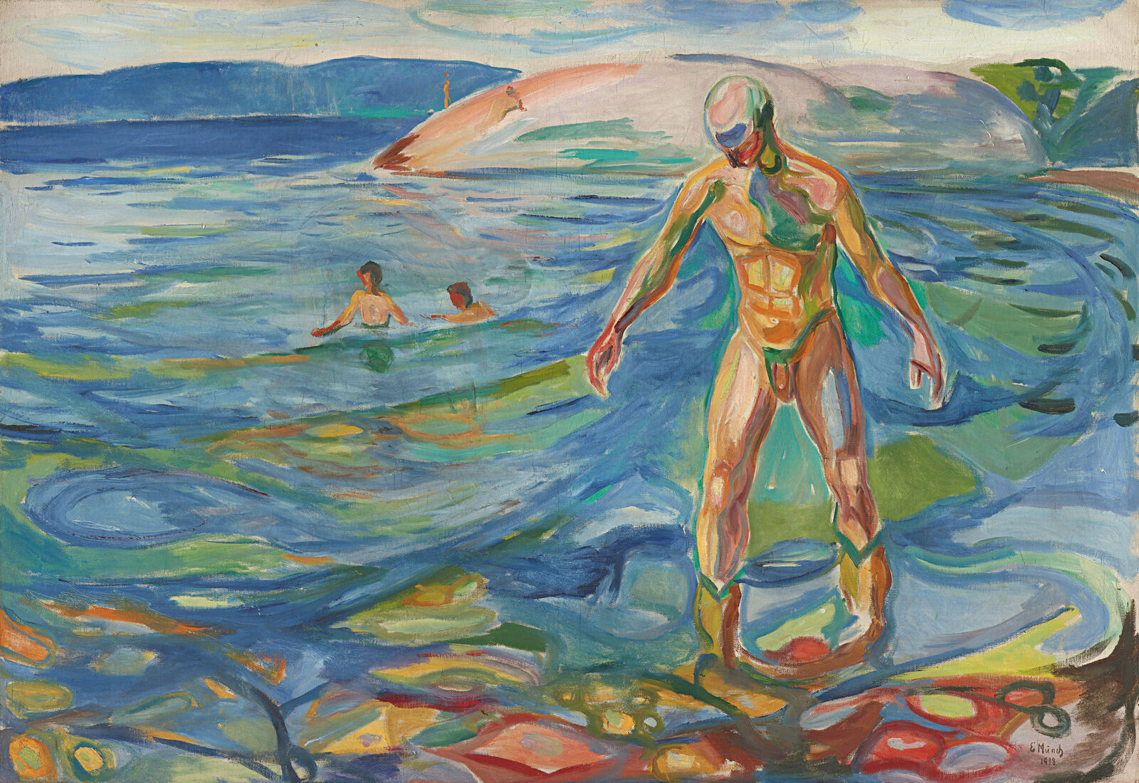 Ten years later, he painted another Bathing Man, probably near Hvitsten, where he owned a house from 1910 on. There he also discovered sunbathers as a motif, symbolizing a kind of energetic connection between human beings and light.