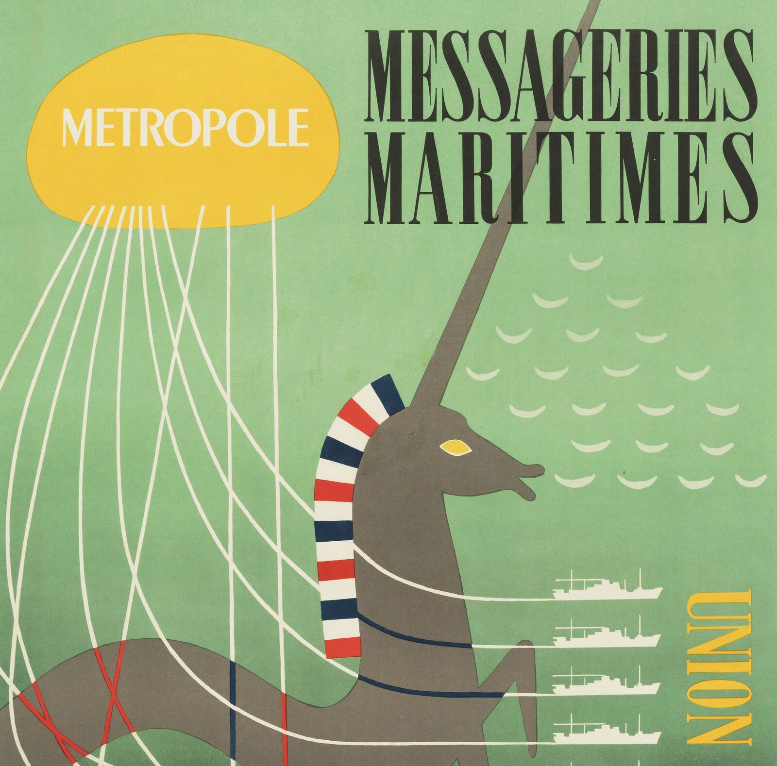 Poulain (active ca. 1950), Marine Unicorn of the Messageries Maritimes, Poster advertising for the shipping company, Messageries Maritimes, 1946–58, Private collection