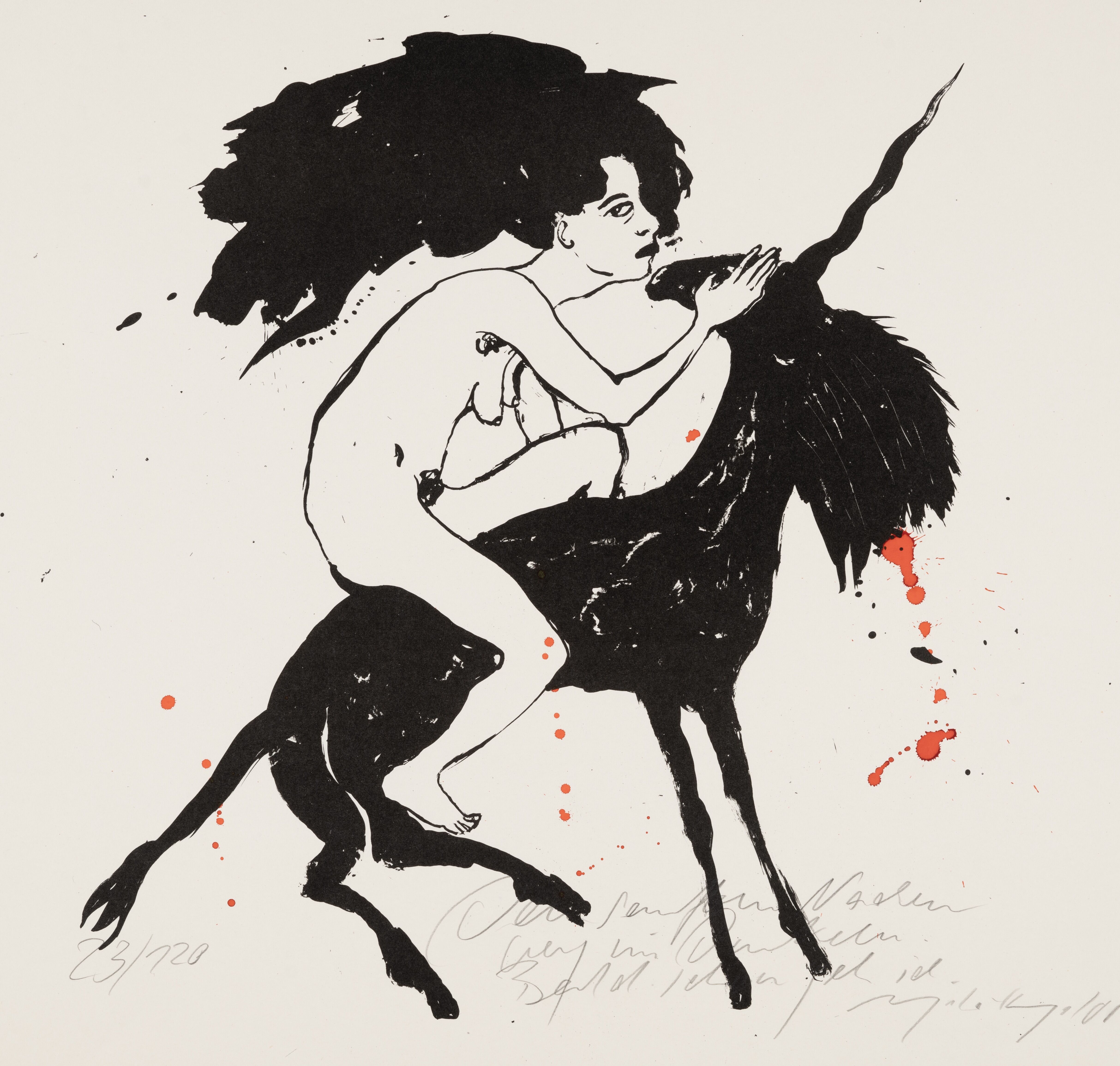 Modern images of the unicorn often echo traditional themes such as the close relationship between woman and unicorn. But as conventional gender roles are increasingly called into question, new facets and associations arise. In the contemporary world, manifestations of the unicorn can be gently ironic, surreal, or even completely abstract.
