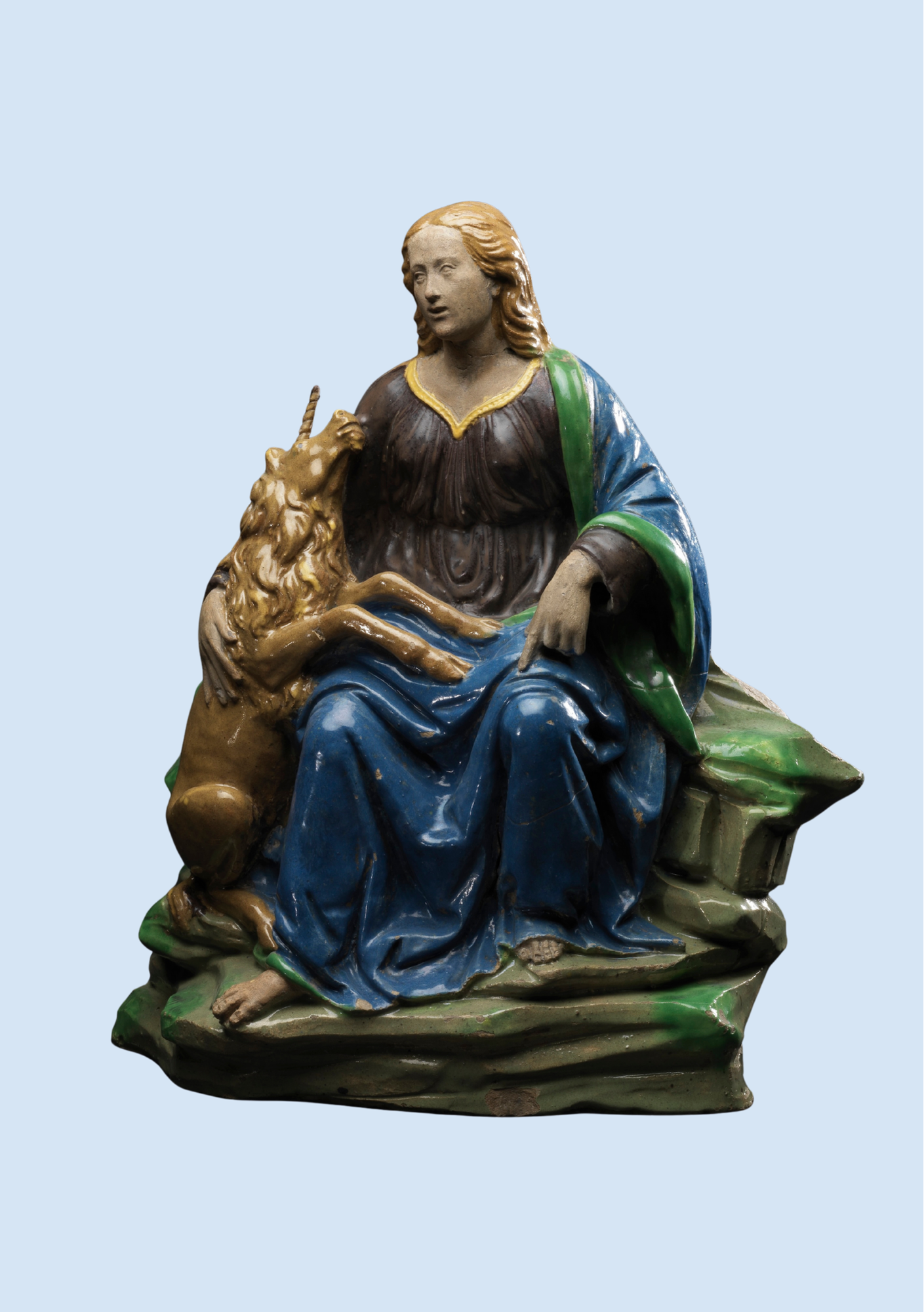 In the development of Christian iconography, the unicorn even came to symbolize Christ. According to a traditional legend, this marvelous creature could only be captured by a “pure virgin”—a figure associated with Mary, the mother of Jesus. Countless images in prayer books and on altarpieces show the unicorn at her side. For medieval theologians, the unicorn represented the Incarnation of God and the virgin conception of Jesus in the womb of the Madonna.