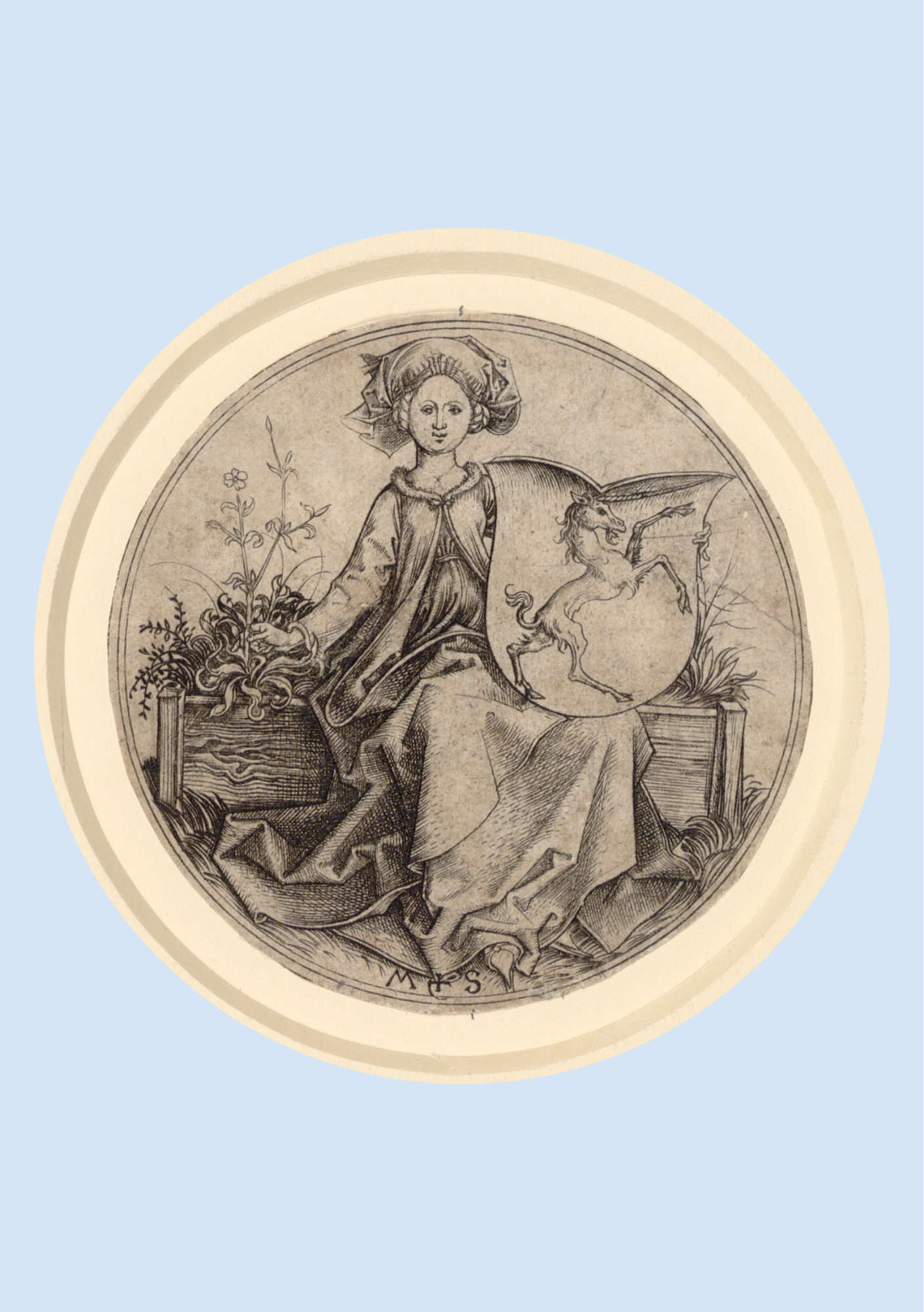 The unicorn has special facets of meaning when it appears in the company of women. Many pictorial representations celebrate the intimate companionship of a noble lady and the graceful, magical animal. The unicorn nestles softly against the woman, who tenderly embraces it: the two seem made for each other. But do such images suggest maternal care, or seduction? Encounters of this kind can have many nuances of meaning. In the poetry of the medieval minnesingers, the “hunt of love” mingled erotic overtones with the unicorn motif; yet themes such as marital fidelity and moral self-control could also come into play. The motif of woman and unicorn reached its zenith between 1350 and 1550—before being revived and reinterpreted by modern artists in more recent times.