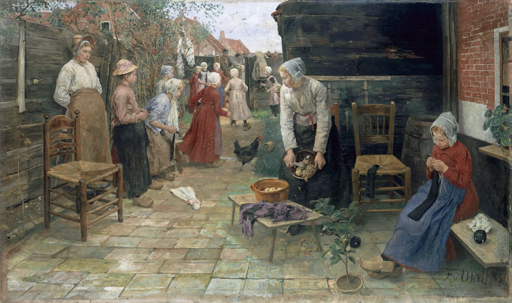 In Freistunde, Max Liebermann unites the socially attuned genre painting pioneered by his beloved Netherlands with an emergent painterly language. This new mode of representation frequently evolved outdoors, at the motif itself—at least in preparatory studies—before finding its final articulation on canvas.