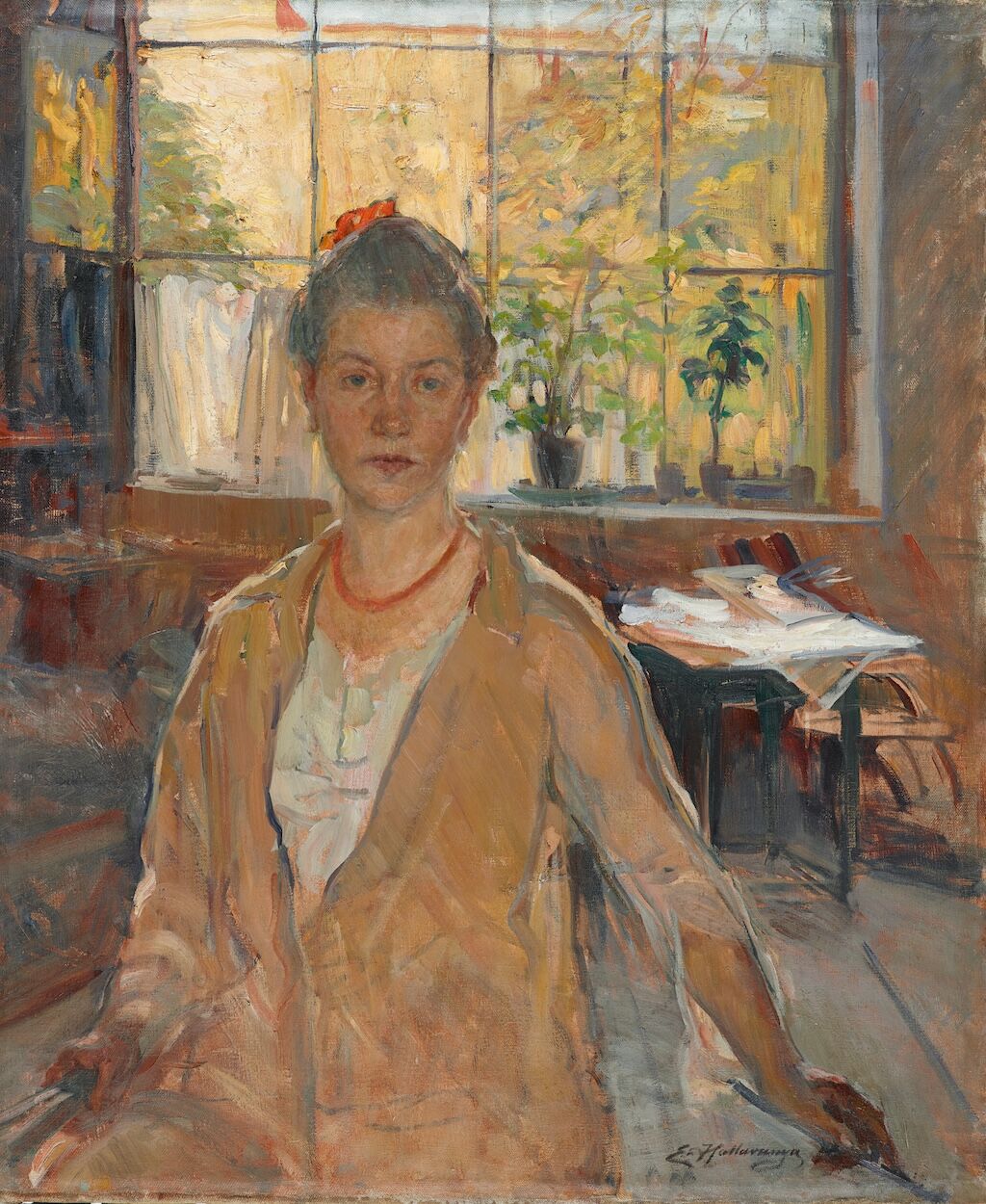 Scenes of private domestic happiness played a central role in the work of Lovis Corinth. In 1904 he married his student Charlotte Berend-Corinth, who frequently served as his model. During a four-day painting session in 1911 he created the interior Lady by the Goldfish Basin: Charlotte seated in a bay window adorned with lush green plants, absorbed in reading. The entire interior is animated by a playful, shimmering light.