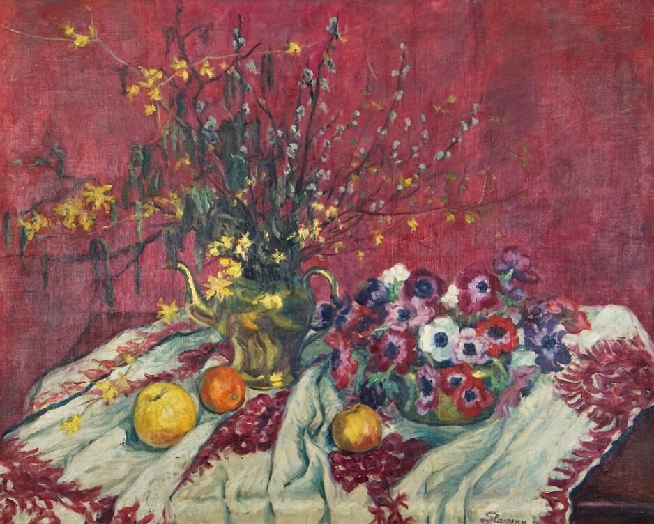 Maria Slavona’s Still Life against a Red Background (1911)