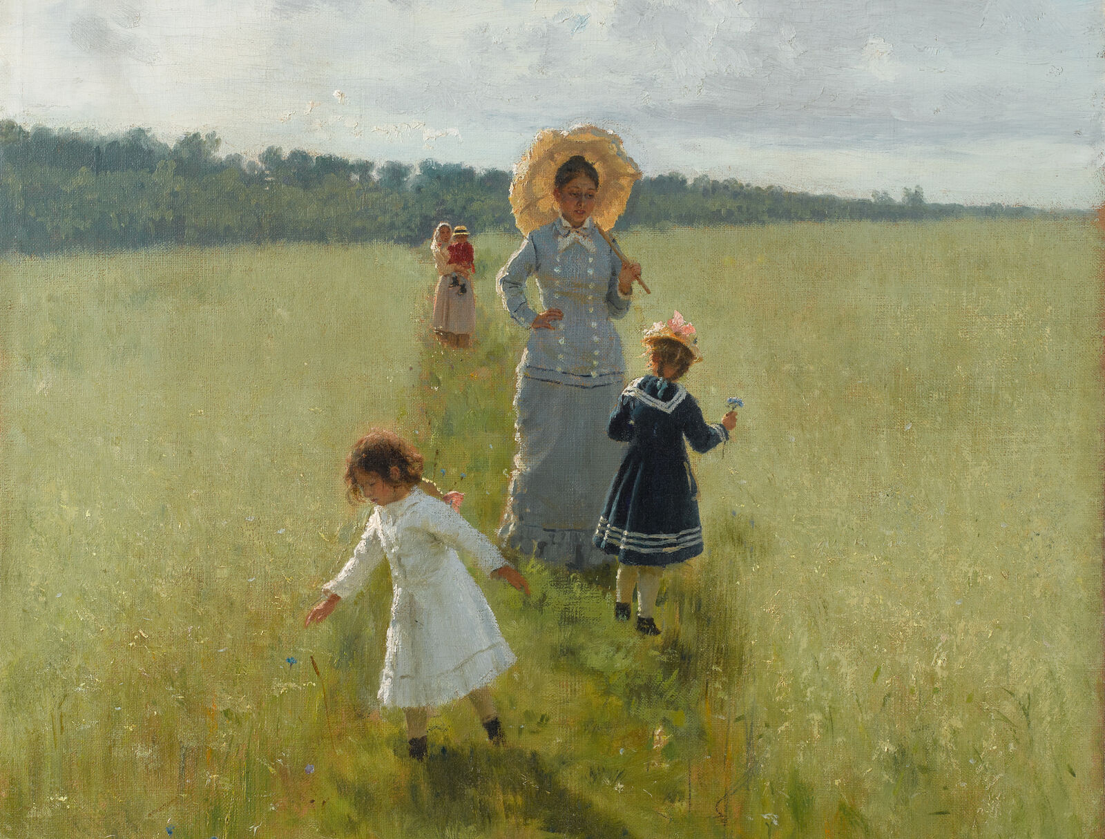 In 1873, a scholarship from the academy in St. Petersburg enabled him to spend several years in Paris. When he returned to Russia, he painted Along the Field Boundary, showing his wife Vera with their children and governess in the countryside near Moscow—a motif entirely in the spirit of Claude Monet.